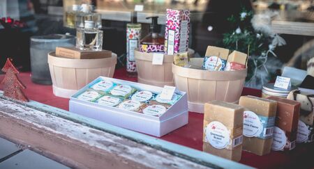 Sete, France - January 4, 2019: Showcase of a local cometic products store and soap on a winter day