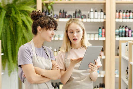 Young confident blond shop assistant with tablet making presentation of new cosmetic products tot colleague or consulting with her