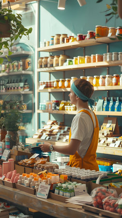 Stocking shelves with freshly arrived inventory, meticulously organizing products to create an inviting display in a modern boutique store.