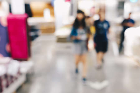 Aerial top view of shopping mall or complex department. Interior design decoration. People make purchases merchandise sale with booth in boutiques.