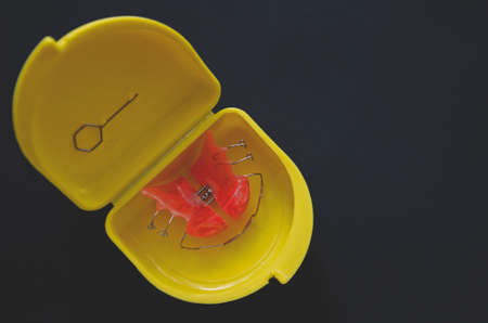 The plate in the box with a key to align the teeth and bite on a black background. Orthodontist treats teeth