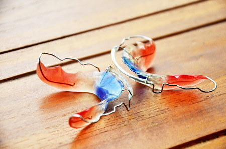 Transparent plastic dental teeth brackets tooth aligners, braces retainers to straighten teeth. Aesthetic and orthodontic modern retainerstoned in neon. Selective focus