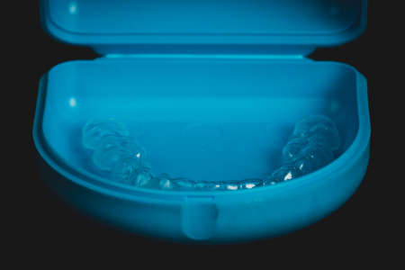 Invisalign transparent braces in a plastic case. Orthodontic invisible retainers and aligners