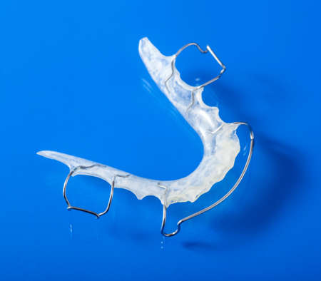 Invisalign braces or invisible retainer on blue background. high quality photo