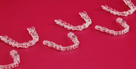 Invisible orthodontics cosmetic brackets on red background, tooth aligners, plastic braces. A way to have a beautiful smile and white teeth.