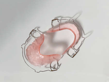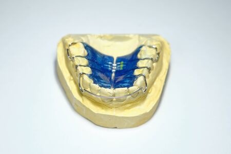 Dental plaster mold and orthodontic silicone trainer. Mobile orthodontic appliance for dental correction, on blue and pink background.