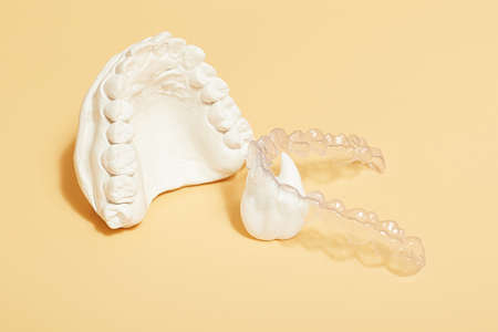 Orthodontic dental theme on yellow background.Transparent invisible dental aligners or braces aplicable for an orthodontic dental treatment