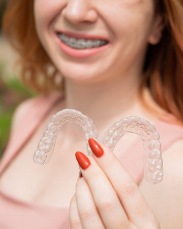 Beautiful young red-haired woman with braces on her teeth holding removable retainers outdoors
