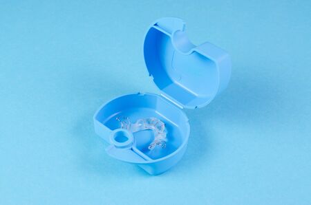 clear plastic retainer teeth in the box set isolated on blue sky background. it's an equipment for orthodontist give the patient to orthodontic surgery in dental clinic or hospital