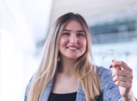 Beautiful Blonde Turkish Woman Is Holding An Invisaligner, copy space includes