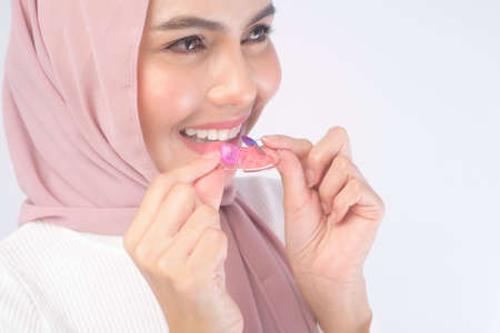 A young muslim woman holding colorful retainer for teeth over white background studio, dental healthcare and Orthodontic concept.