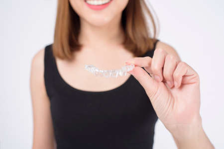 Young smiling woman holding invisalign braces in studio, dental healthcare and Orthodontic concept