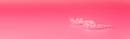 Panoramic photo Invisible teeth retainers lie on a bright pink background. Close-up of a modern way to straighten teeth