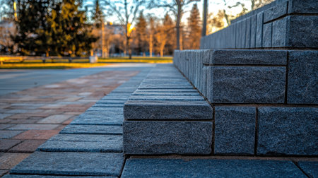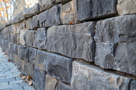 Mortared stone wall in an urban setting, featuring a smooth finish and varied shades of grey. AI generated.