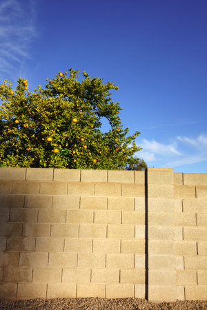 December first oranges ripening among dense green leaves in a crown of citrus tree above block fence against blue sky