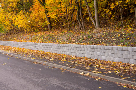 A retaining wall made of concrete elements protects the roadway and pavement from sliding down the slope.