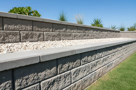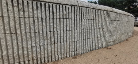 A retaining wall made of textured stone blocks.