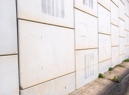 A close-up of a prefab concrete panel with detailed stone-like texture, forming part of a boundary fence.