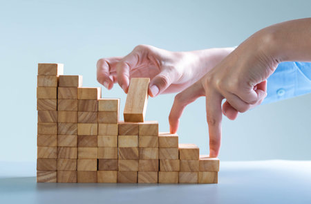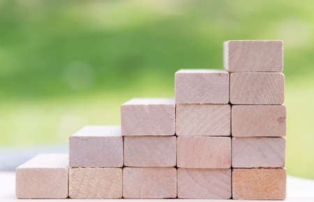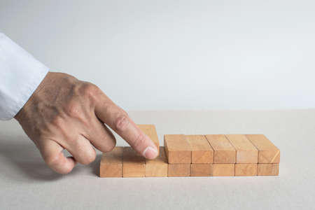 Business growth and management concept. Stack wood cubes on light background. Hand arranging wood cube stacking as stair step shape, mock up for create symbol or logo. Copy space.