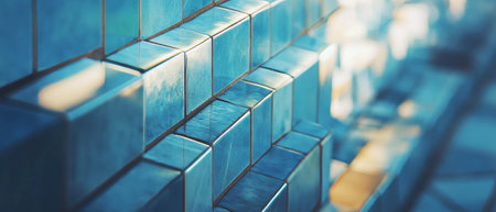 This image showcases a striking arrangement of metallic and textured blocks, beautifully reflecting light and casting shadows in a contemporary industrial setting.