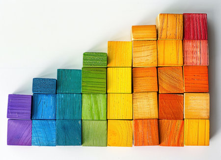 colorful wooden blocks arranged in a gradient formation showcasing bright hues from purple to orange on a white background for educational or decorative purposes