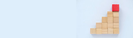 Steps of wooden cube with a red cube on top. Business concept for growth success process. Banner with copy space.