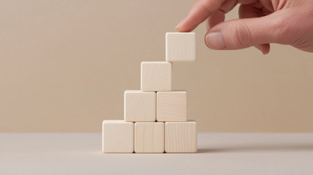 A hand gently placing a wooden cube atop a pyramid of blocks on a neutral background, symbolizing creativity, education, and developmental play in a minimalist design.