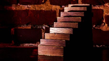 Stair step of wooden cube as bar graph mock up for create symbol on wood plate with black background and copy space. Business and finance concept challenge leadership successfully.