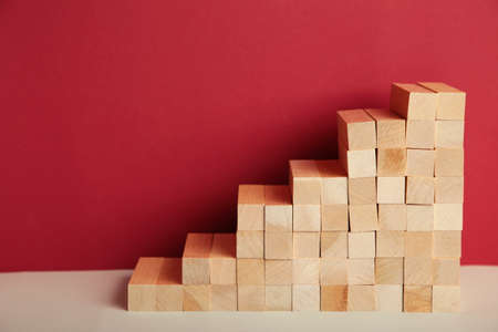 wooden block stacking as step stair on blue background. Business concept for growth success process.