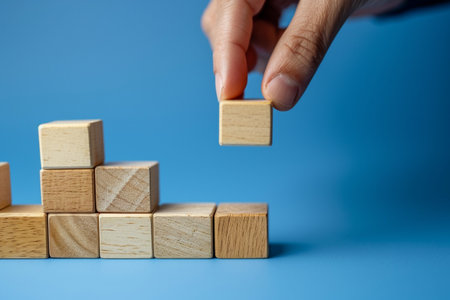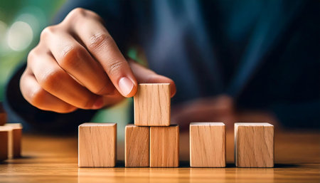 A close-up view of a hand carefully stacking wooden blocks in an ascending order, symbolizing growth and progress. The vibrant green background enhances the image's theme of development and creativity in business.
