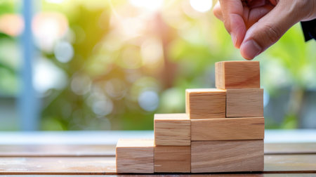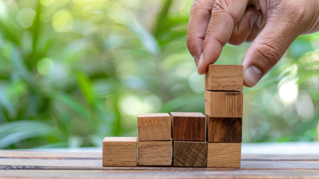 A close-up of a hand placing a wooden block onto a stack of wooden blocks, symbolizing strategic growth and achievement in a natural setting.