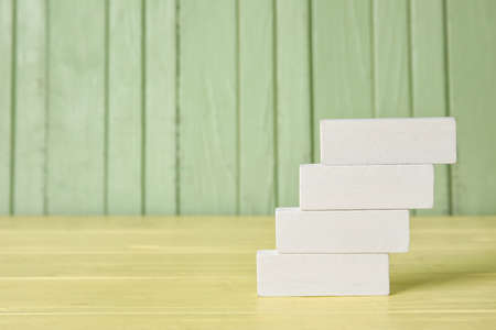 Wooden cubes stacked in the form of a pyramid without graphics on a green wall background, business growth and teamwork concept, leadership symbol, template for design,
