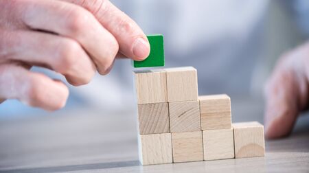 Concept of building success foundation. Men hand put wooden blocks on the stack of wooden blocks.