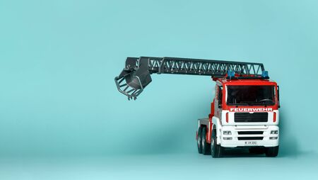 Powerful fire truck standing front and center, its sirens and ladder extending into the sky.