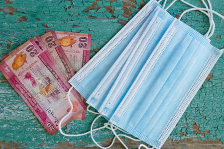 Medical masks on top of the Sri lanka rupees bank notes on background of green cracked paint on wooden planks. Corona virus lockdown.