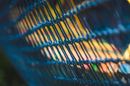 Close up of a blue tennis net with a blurred background, in a flat lay composition, with macro photography, from a low angle shot, with soft light, with professional color grading, as a stock photo, with high resolution, with sharp focus, with no contrast, with a natural look.