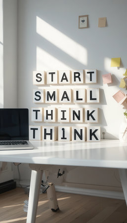 A motivational desk setup featuring scrabble-like letters spelling START SMALL THINK BIG alongside a laptop and a plant, ideal for inspiration.