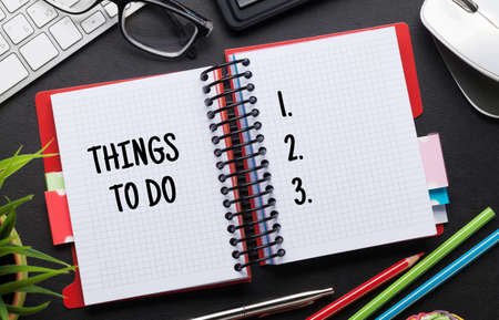 Office desk with to do list notepad and supplies. Top view flat lay