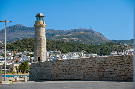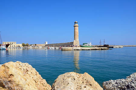 Crete, Greece - April 26 2018: Lighthouse at old Venetian harbour, Rethymno (Rethymnon), Crete, Greek Islands, Greece Europe