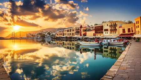 Aerial View of Chania Town and Venetian Harbor at Sunset, Crete