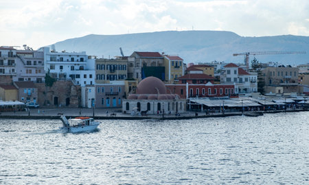 CHANIA, THE CRETE ISLAND, GREECE - MAY, 19, 2018: Mosque at the seafront of old town of Chania. The city is famous for venetian architecture, as well as for its interesting cultural life and cuisine
