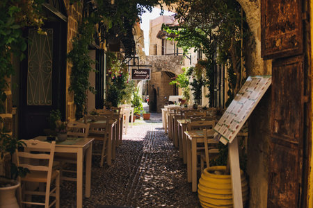 RHODES TOWN, RHODES ISLAND, GREECE - JUNE 30, 2022: View of the traditional taverns and restaurants, in the Greek Mediterranean architecture of the old town, Aristotelous street.