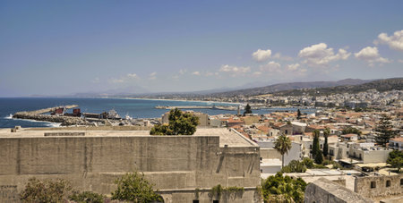 Rethymno, Greece - July 30, 2016: Panoramic view to Rethymno from Fortezza castle. Rethymno is a city of approximately 40,000 people in Greece, the capital of Rethymno regional unit on the island of Crete. The old town of Rethymnon is one of the best-pre
