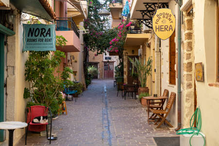 Rethymno Greece Crete. Walk around the old resort town Rethymno in Greece. Architecture and Mediterranean attractions on island Crete. Narrow touristic street in the tourist routes