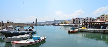 RETHYMNO, GREECE - 08.04.2016: old venetian harbour with boats and lighthouse panorama view