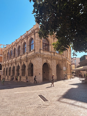 People enjoying a sunny summer day while walking around the historic venetian loggia building in heraklion, crete, exploring ancient architecture and greek culture