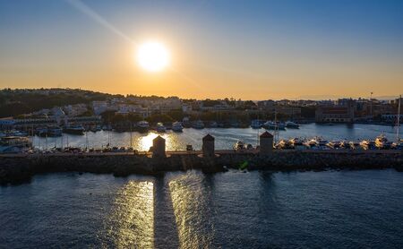View of Mandraki port with clear blue water in Rhodes city. Famous tourist destination in South Europe. Rhodes island, Dodecanese, Greece