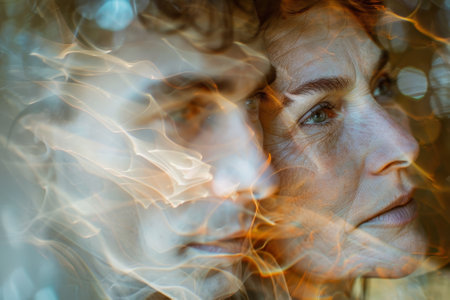 A woman and a man are reflected in a blurry image of fire. The image has a dreamy, surreal quality to it, as if the two people are floating in a world of smoke and flames