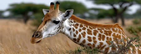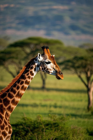 A stunning giraffe gracefully poses in the golden savannah, surrounded by lush greenery and distant hills. This captivating image captures the essence of wildlife, showcasing the giraffes elegant stature and unique patterns against a serene backdrop.