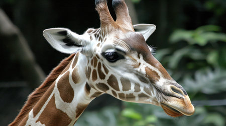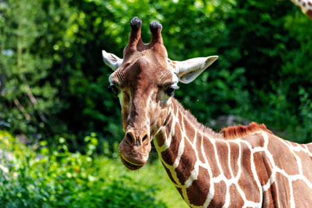 A close up view of a giraffe displaying its distinct patterns and gentle expression in a green environment during the day